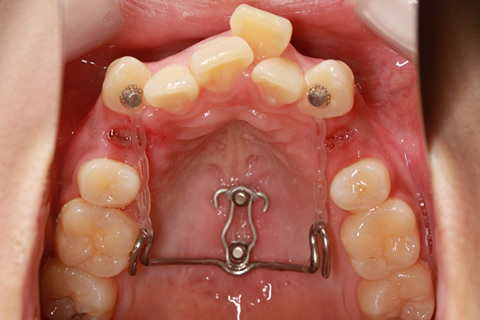 直径6ミリ程のスクリュータイプのミニインプラントを歯ぐきに埋めることで、良好な治療結果が得られ、治療期間も短縮できます。また大がかりな矯正装置を使う必要がなくなります。当院では、通常、上アゴの奥に2本埋め込みます。歯ぐきに埋め込むといっても、局所麻酔下にて行いますので、痛みはなく10分程度で終わる簡単な埋め込み術です。